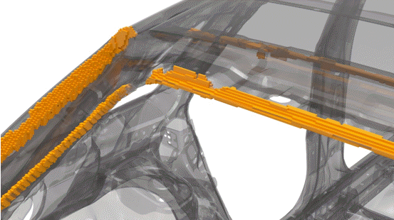 The Adhesives tool automatically identifies flange locations from the selected entities. It also creates TIE-based contact between the Adhesives design space (voxels) and the structural elements nearby. It does not add any additional stiffness as it will not create contacts between structural parts. Like Global and Local design spaces, Adhesive design spaces creates a topology design variable.