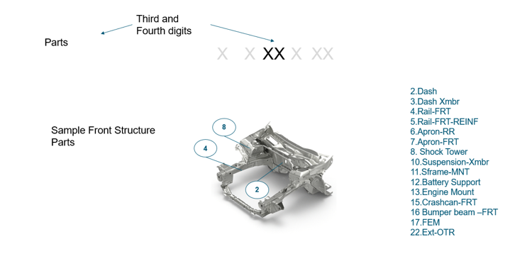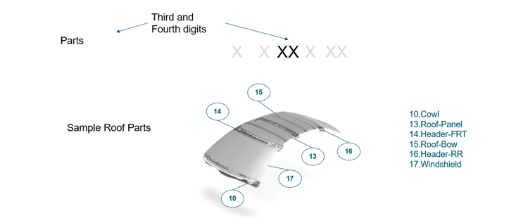 - The third and fourth digits correspond to parts from the assembly. Each assembly has a number of parts; for example, the list of sample parts goes to 11 in Figure 8.