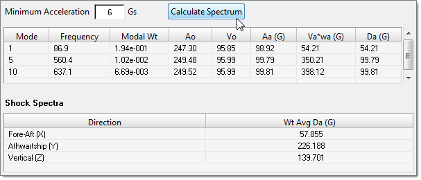 The Shock Spectra curves are calculated, and the mode table and weighted average Da values are populated.