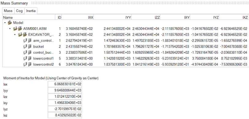 Figure 2.CoG and inertia selected as the Result Type, per component: