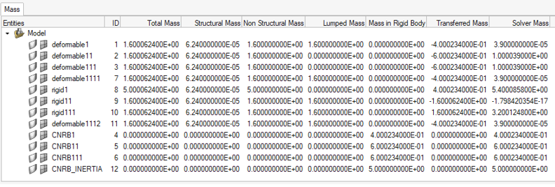 - The sum of the Mass in Rigid Body column and represents the total mass of the nodal rigid body elements in the model.