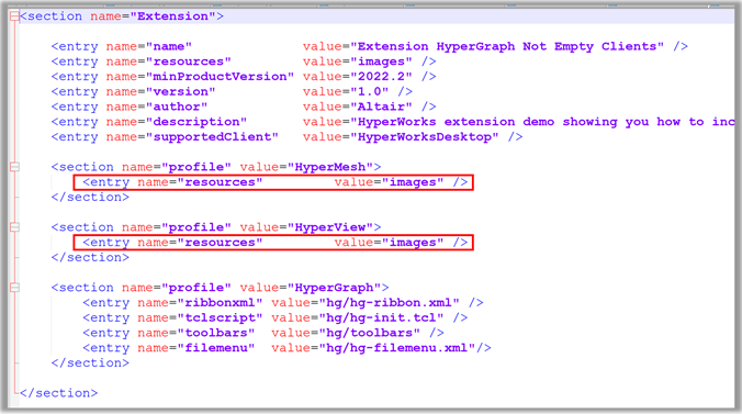 profile is loaded with at least one entry. The example below shows the empty HyperMesh and HyperView profiles with the (dummy) entry resources. This entry will not be required in future versions to show the extension loaded in these profiles.