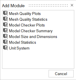 Validate group contains modules associated with high level diagnostic information of the model such as model statistics, mesh quality statistics, model checker summary and more.