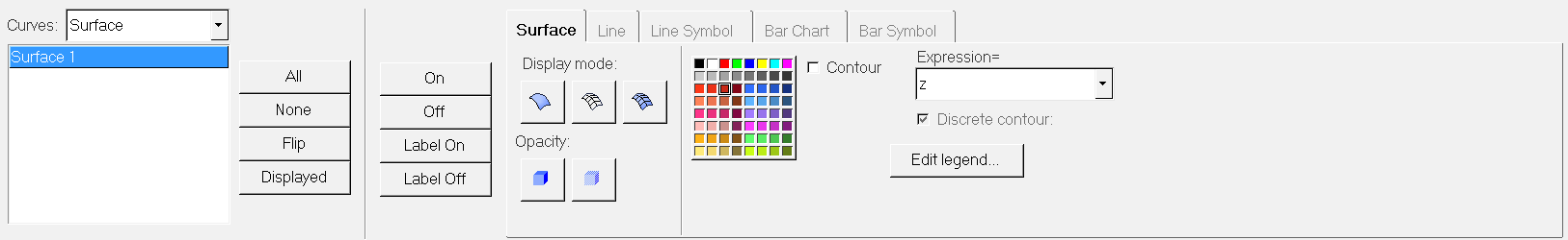 Surface attributes, such as Surface style, color, and weight are located in the Curve Attributes panel. This panel also allows you to contour the surface and edit the legend.