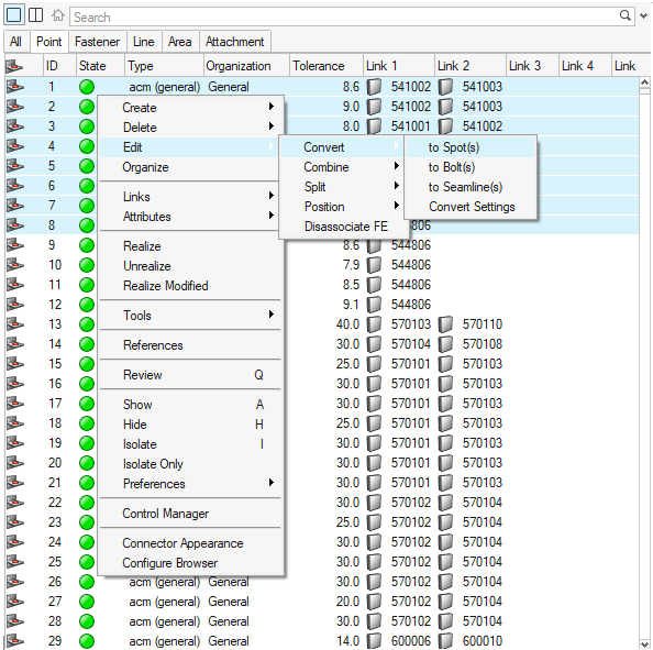 Highlight the connector(s) you want to convert, then right-click and select Convert > Style (spot, bolt, seamline) from the context menu.