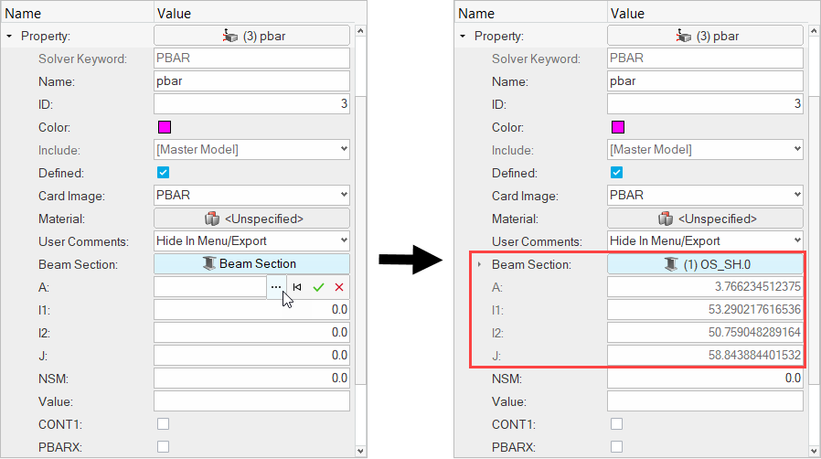 Every element, including beam, bar, and rod elements, must exist within a component. A property can be assigned to a component, or to an individual element. If there is a conflict with properties assigned directly to elements and properties assigned to components, direct element property assignment takes precedence. 1D properties hold the section information such as areas, inertias, or even specific dimensions in the case of standard sections. 1D elements hold the orientation and connectivity information. Beamsections hold section geometry information and section calculation data, just the same as a 1D property. In fact, when a beamsection is assigned to a property, it will automatically take over the property and fill in the necessary fields. The 3D visualization operates based on the beamsection’s stored geometric data. To disassociate a beamsection from a property, right-click on the beamsection selector in the property card image.