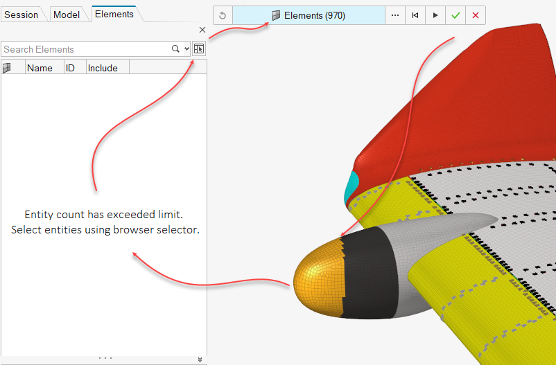 Note: When unnamed entities (Nodes, Elements, and so on) exceed the threshold value, the selection context is automatically invoked upon opening the respective entity view.