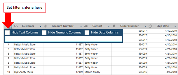 Check the boxes corresponding to Hide Text Columns, Hide Numeric Columns, and/or Hide Date Columns.