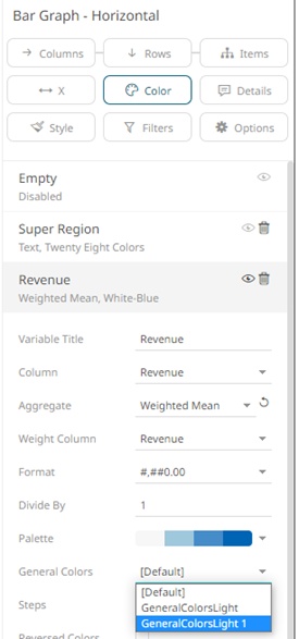 Once saved, in the Open Workbook layout in Design mode, when the Light workbook theme is selected on the opened workbook, all of the defined general colors will be added as options in the General Colors drop-down list of a Color variable in a visualization.
