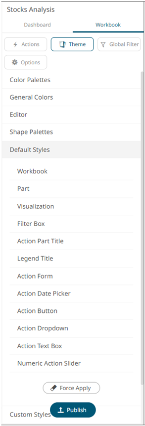 14. To define the default styles of the workbook theme, click Default Styles section to expand.
