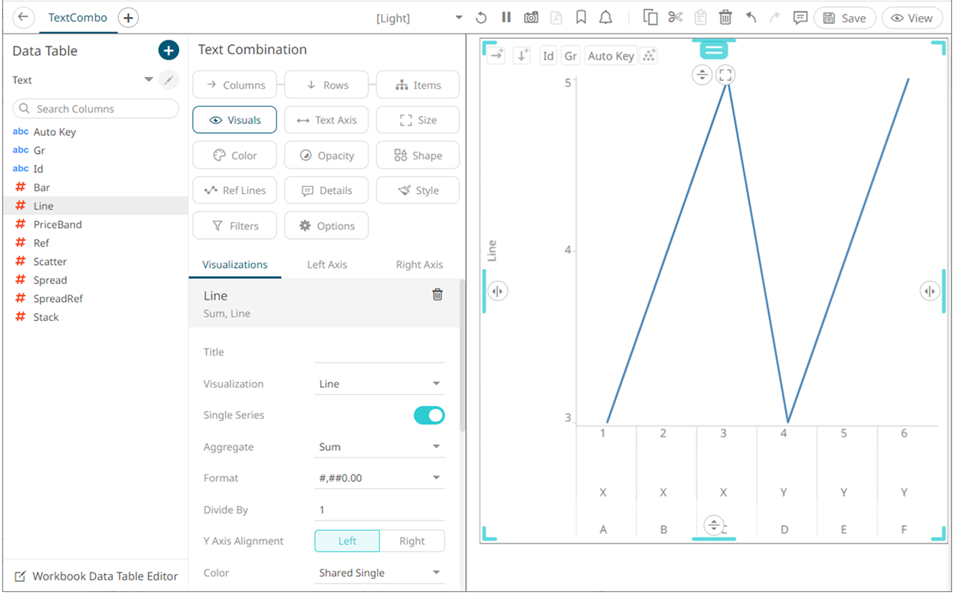 7. The text combination visualization includes an expanded axes pane, which includes specification of the properties for both the Left and Right Y axes.