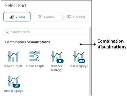The Select Part pane has three tabs to define the settings of the dashboard visualization or part.