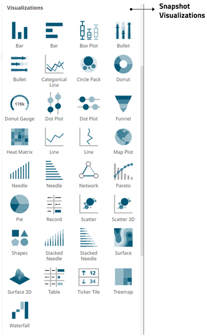 Some of the most common use cases for data visualization software require the system to display information about a data set as it exists at a particular point in time. These snapshot visualizations are extremely useful for understanding relative quantitative and qualitative measures and enable users to gain a comprehensive understanding of complex data sets very quickly. You must populate visualizations with data columns for them to function. |