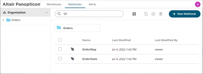 You can also enter one of more characters into the Search Webhooks box then click Enter. The suggested list of webhooks that matched the entries will be displayed.