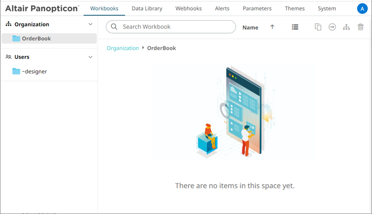 Users that log on with a Designer role will have their own personal folder created and displayed on the Workbooks page (e.g., ~designer). The personal folders: · are displayed and can be accessed for users with an Administrator or Designer role. · are where Designers can create workbooks and build dashboards. For more information, refer to Altair Panopticon Web Authoring Guide on how to create workbooks on the Web client. |