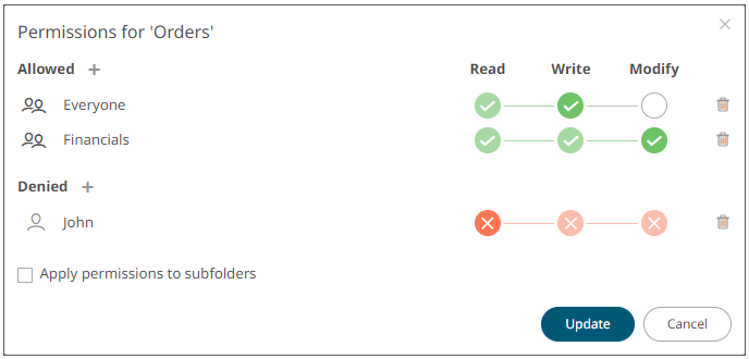 · leave the Apply Permissions to Subfolders boxunchecked and modify the permission properties of the subfolders