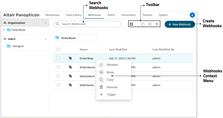 Allows renaming, moving, copying, deleting, and enabling of the trigger of webhooks. |
