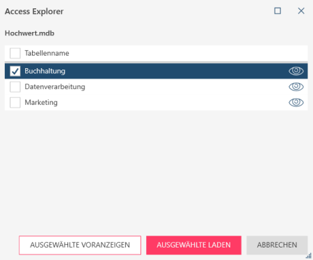 Wenn dateibasierte Datenquellen geöffnet werden, müssen über einen Explorer andere Einstellungen festgelegt werden, um sicherzustellen, dass die richtige Tabelle in die Anwendung importiert wird. Wenn Ihre Datenquelle beispielsweise eine Microsoft Access-Datei ist, die mehrere Tabellen enthält, können Sie über den Access-Explorer auswählen, welche Tabellen geöffnet werden sollen.