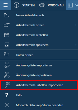 Klicken Sie auf das Anwendungsmenü-Symbol in der linken oberen Bildschirmecke und wählen Sie aus den angezeigten Optionen Arbeitsbereich-Tabellen importieren aus.