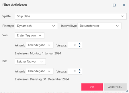 Sie können zum Beispiel den Filter auf BillDate = 12. Mai 2024 setzen. Der Filterwert bleibt dann gleich, wenn Sie den Bericht einige Tage später öffnen.