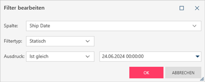 Um statische Filter zu definieren, wählen Sie einen Operator aus und legen Sie den Datums-/Uhrzeitwert fest.