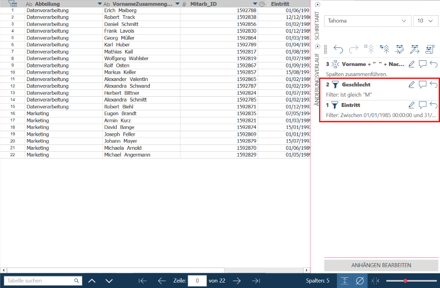 Mit dieser Funktion können Sie unerwünschte Daten aus den in der Tabelle angezeigten Datensätzen entfernen, damit Sie nur mit den gewünschten Daten arbeiten können. Gefilterte Spalten tragen das Filtersymbol links von der Spaltenüberschrift.