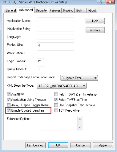 Wenn Sie den ODBC-Treiber für die Verwendung mit dem Connector konfigurieren, müssen Sie ggf. quotierte Bezeichner aktivieren (z.B. die Optionen Enable Quoted Identifiers oder ANSI Quoted Identifiers).
