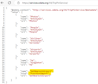 Gehen Sie im Browser zu https://services.odata.org/V4/TripPinService/$metadata, um das Entitätsdatenmodell des OData-Dienstes anzuzeigen. Suchen Sie auf der Seite nach „GetNearestAirport“ und suchen Sie nach dem Entitätssatz-Wert.