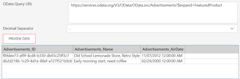 Begrenzung: In einigen Fällen werden Abfrageparameter nicht gespeichert oder im Connector-Formular angezeigt, wenn Sie eine erweiterte Sammlung auswählen, aber die OData-Abfrage-URL ist weiterhin gültig.