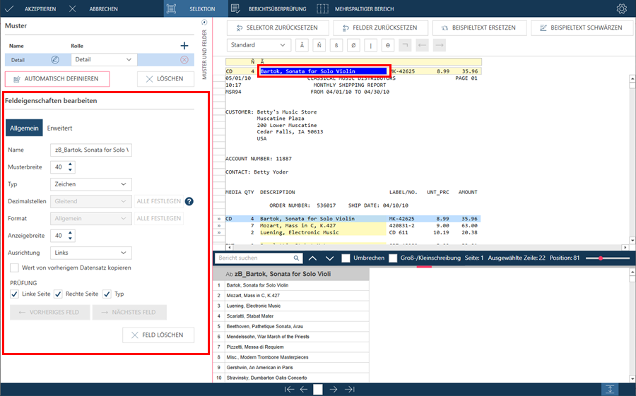 In einigen Berichten befinden sich die Detailfelder auf mehreren Zeilen, d. h. in einem Textblock. Es kann jedoch auch sein, dass die erste Zeile eines Textblocks nicht durch eindeutige Eigenschaften markiert ist.. Wenn Zeile 1 nicht verwendet werden kann, können Sie eine andere Zeile mit eindeutigen Eigenschaften angeben. In diesem Fall muss im Feld Selektorzeile die Beispielzeile angegeben werden, auf deren Basis die Selektion ausgeführt werden soll.
