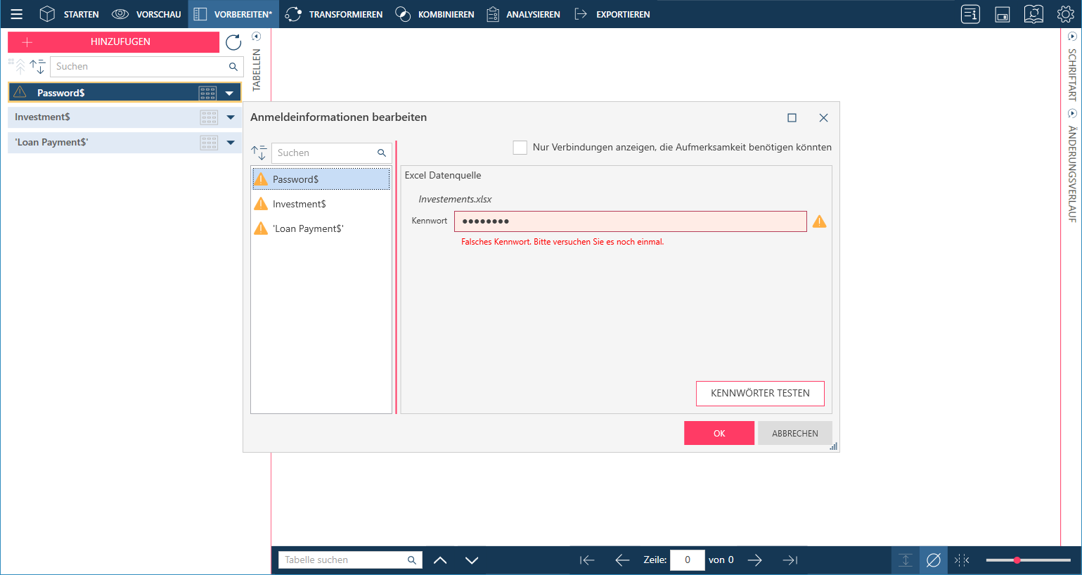Das Dialogfeld „Zugangsdaten bearbeiten“ wird unmittelbar nach dem Öffnen eines Arbeitsbereichs mit Datenquellen-Eingaben mit Passwörtern, die beim Speichern des Arbeitsbereichs gelöscht wurden, angezeigt.