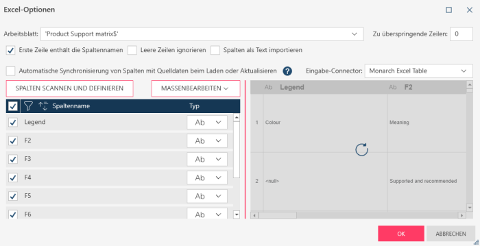 - Eine andere Tabelle/ein anderes Arbeitsblatt aus der Access-/Excel-Datei auswählen