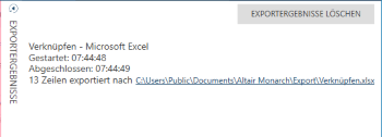 Sie können alle Exportergebnisse aus diesem Fensterbereich löschen, indem Sie oben rechts im Fensterbereich auf Exportergebnisse löschen klicken.