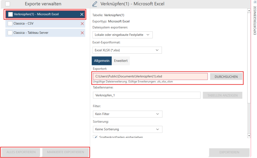 Wenn Sie mehrere Exporte konfiguriert haben und eine Exportvalidierung stattfindet, z. B. wenn die Dateierweiterung für einen bestimmten Export nicht mit den zulässigen Erweiterungen für einen bestimmten Exporttyp übereinstimmt oder der Dateiname zu lang ist, wird die Schaltfläche Alle exportieren deaktiviert und der problematische Export wird durch einen roten Rahmen im Fensterbereich Exporte verwalten gekennzeichnet. Die Probleme im Zusammenhang mit diesem Export müssen behoben werden, bevor alle Exporte ausgeführt werden können.
