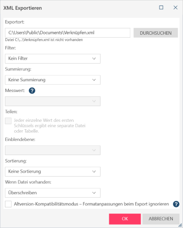 Diese Einstellung gibt an, wo die Exportdatei gespeichert und wie sie benannt wird. Geben Sie den Pfad und den Namen der Exportdatei an. Sie können Makros (mit dem Format &[Makro]) in den Dateinamen einbetten.
