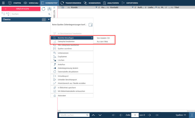 Klicken Sie im Tabellenselektor mit der rechten Maustaste auf eine berichtsbasierte Tabelle, die in einen Arbeitsbereich exportiert werden soll. Wählen Sie dann unter den angezeigten Optionen Arbeitsbereich aus Tabelle erstellen > Mit Dateien aus, um die Berichtsdateien einzubeziehen, oder Arbeitsbereich aus Tabelle erstellen > Ohne Dateien, um die Berichtsdateien vom Exportvorgang auszuschließen.