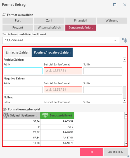 Um positive Zahlen, negative Zahlen und Nullen zu formatieren, stellen Sie sicher, dass die Registerkarte Positive/negative Zahlen ausgewählt ist. Geben Sie dann ein Formatbeispiel und den gewünschten Präfix und/oder Suffix für die positiven, negativen Zahlen und Nullen an. Klicken Sie auf die Schaltfläche Generieren, um ein Beispiel der Zahlen mit der ausgewählten Formatierung anzuzeigen. Beachten Sie, dass die Schaltfläche „Generieren“ deaktiviert ist, wenn kein benutzerdefiniertes Format für einen bestimmten Zahlentyp (positiv, negativ und Null) angegeben wurde oder wenn alphabetische Zeichen oder Sonderzeichen in eines der Felder für das Zahlenformat-Beispiel auf dieser Registerkarte eingegeben werden.