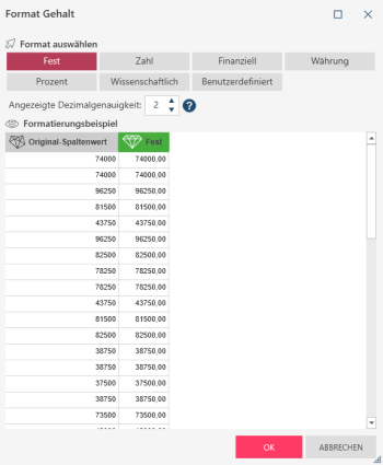 Wählen Sie eines der vordefinierten Formate(Fest, Zahl, Finanziell, Währung, Prozent, Wissenschaftlich) aus, um diese Formate auf Ihre numerischen Spalten anzuwenden. Sie können auch Benutzerdefiniert auswählen, um Ihr eigenes benutzerdefiniertes Format einzugeben:
