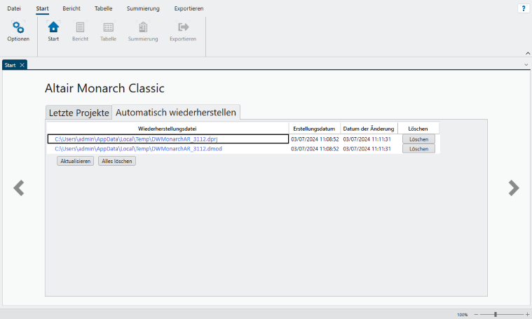 Monarch Classic bietet eine Einstellung, mit der Sie automatisch das zuletzt aufgerufene Modell und Projekt wiederherstellen können, wenn der Dienst versehentlich beendet wird oder die Anwendung abstürzt. Diese Einstellung befindet sich unter Optionen > Erweitert > Automatisch wiederherstellen.