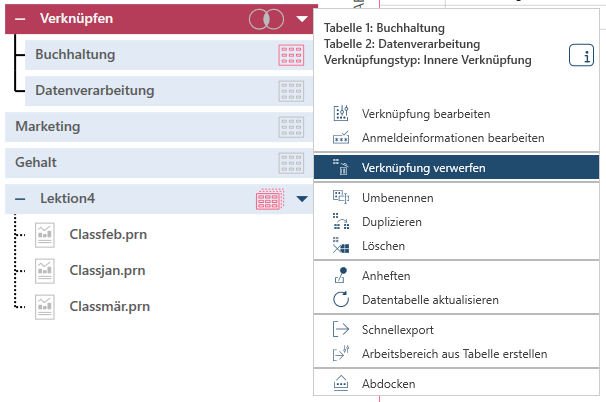 oben rechts in der Phase „Daten kombinieren“ aus. Dadurch werden alle Tabellen, die bereits in der Verknüpfungsstufe sind – einschließlich der zuvor definierten Verknüpfung – entfernt. Sie können nun mit einer neuen Verknüpfung beginnen.