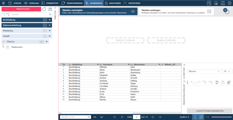 Die Phase „Kombinieren“ ermöglicht das Erstellen von Verknüpfungen zweier Tabellen in einer einzigen Verknüpfungssitzung. Verknüpfen Sie zwei oder mehr Tabellen, wenn Sie die Datensätze der beiden Tabellen zu einer Tabelle zusammenfassen möchten. Verknüpfungen ermöglichen das Konsolidieren von Daten und damit einen umfassenderen Überblick über die darin enthaltenen Informationen.