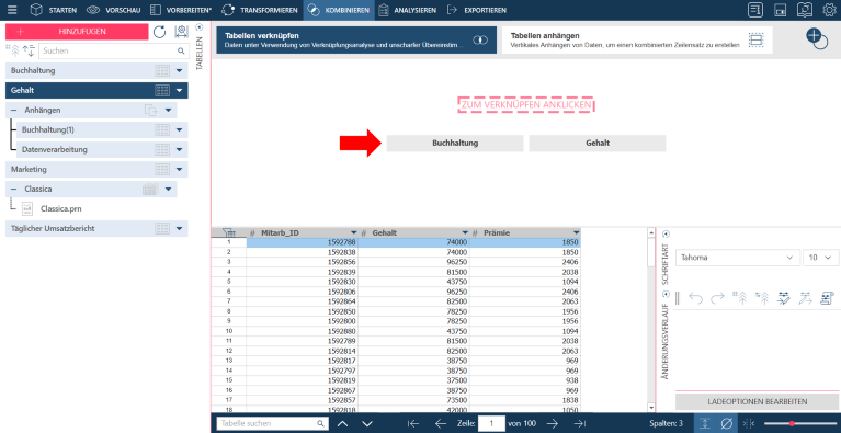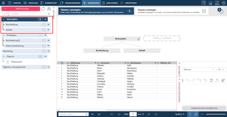 Klicken Sie nach dem Laden der Daten in das Fenster Vorbereiten auf Kombinieren > Verknüpfen, um die Verknüpfungsphase zu aktivieren.