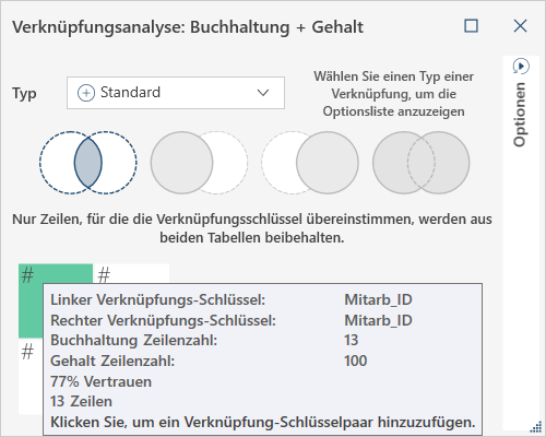 In diesem Beispiel sitzt der Mauszeiger auf dem Feld mit dem Wert 65 %. Das Popup-Fenster zeigt, dass die Verwendung von Mitarb_ID in der Tabelle Buchhaltung und Mitarb_ID in der Tabelle Gehalt einen Übereinstimmungswert von 65 % ergeben würde.
