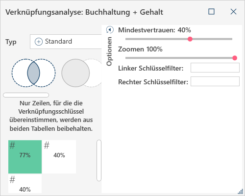 Im Dialogfeld werden dann die Verknüpfungsfelder angezeigt, die zu den besten Ergebnissen führen (je höher der Prozentwert, desto mehr Zeilen werden durch die Verknüpfungsschlüsselkombination verknüpft). Setzen Sie den Mauszeiger auf einen Prozentwert, um die Verknüpfungsschlüsselkombination zu ermitteln: