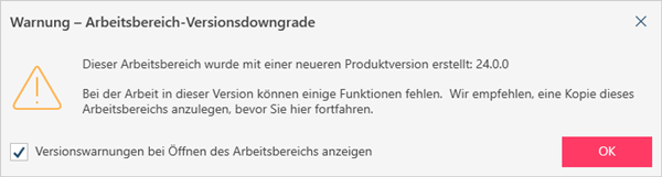 „In dieser Version können einige Funktionen fehlen. Wir empfehlen Ihnen, eine Kopie dieses Arbeitsbereichs zu erstellen, bevor Sie fortfahren. Die Verwendung einer älteren Version zum Speichern dieses Arbeitsbereichs führt zum Verlust von Funktionen, die mit neueren Versionen des Produkts verbunden sind.“