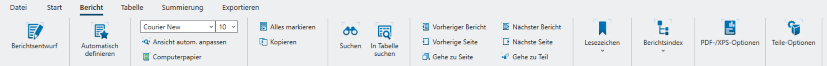 Die Multifunktionsleiste „Berichtsansicht“ wird angezeigt, wenn auf der Start-Multifunktionsleiste oder auf den Registerkarten des Monarch Classic-Fensters die Option Bericht ausgewählt wird.