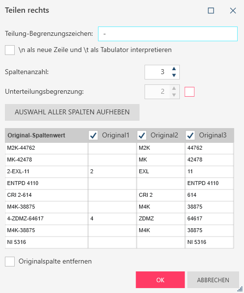 Sie können die Spaltenanzahl und die Teilungsgrenze ändern, indem Sie die gewünschten Werte für diese Felder angeben. Wenn die Spaltenanzahl im obigen Beispiel auf 2 reduziert wird und die Teilungsgrenze von 2 beibehalten wird, ergibt der Teilungsvorgang für 4-ZDMZ-64617 zwei Spalten: eine mit dem Wert ZDMZ und die andere mit dem Wert 64617. Wenn die Teilungsgrenze stattdessen auf 1 gesetzt und die Spaltenanzahl von 3 beibehalten wird, ergibt der Teilungsvorgang drei Spalten: die erste mit einem Nullwert und die zweite und dritte mit den Werten 4-ZDMZ bzw. 64617.