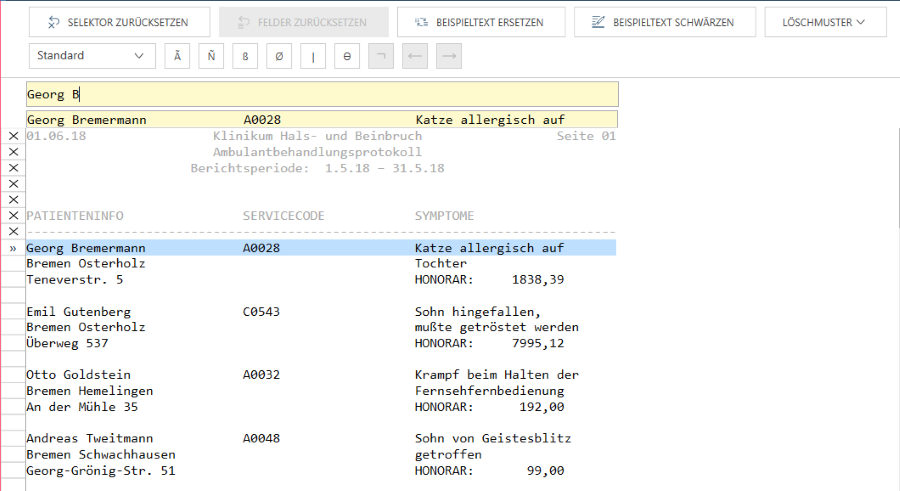 Wenn ein Muster, wie zum Beispiel ein Detailmuster, nach Angabe von Start-/Endregionmustern angegeben wird, steht nur der Bereich zwischen den Zeilen, die mit „Michael“ anfangen und mit „Cleveland“ aufhören für die Erfassung zur Verfügung.