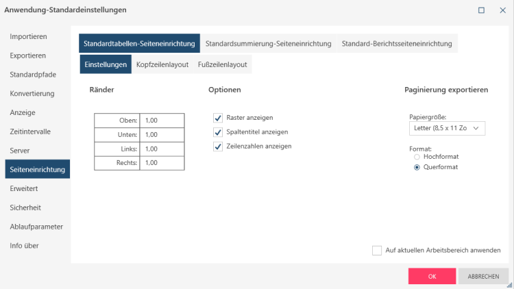 Die folgenden Standardeinstellungen für die Seiteneinrichtung gelten für Tabellen, Summierungen und Berichte, sofern nicht anders angegeben.