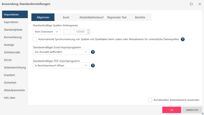 Wählt ein standardmäßiges Excel-Importprogramm aus, wenn kein Programm explizit ausgewählt wurde (wenn z. B. eine Excel-Datei in die Anwendung gezogen wird oder die Schaltflächen „Datei öffnen“ oder „Web-Datei öffnen“ im Dialogfeld „Daten öffnen“ ausgewählt werden).
